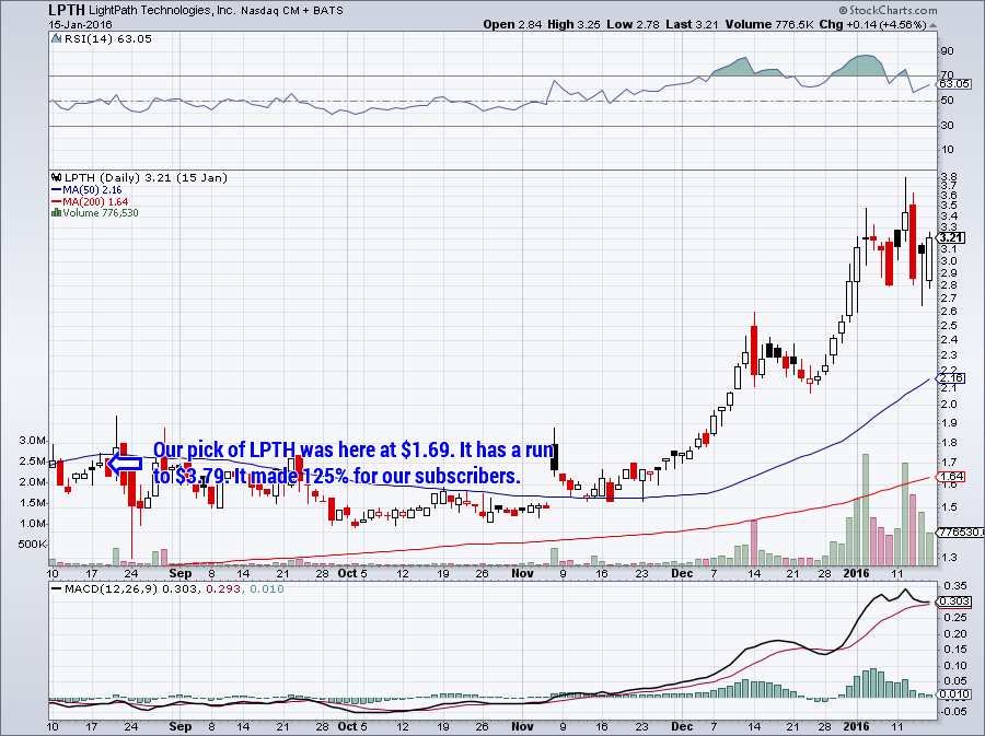 LPTH (long buy) - our pick of LPHT was on August 18th, 2015 with a profile price at $1.69 – January 12, 2016 the stock gained 125% for our subscribers hitting $3.79.