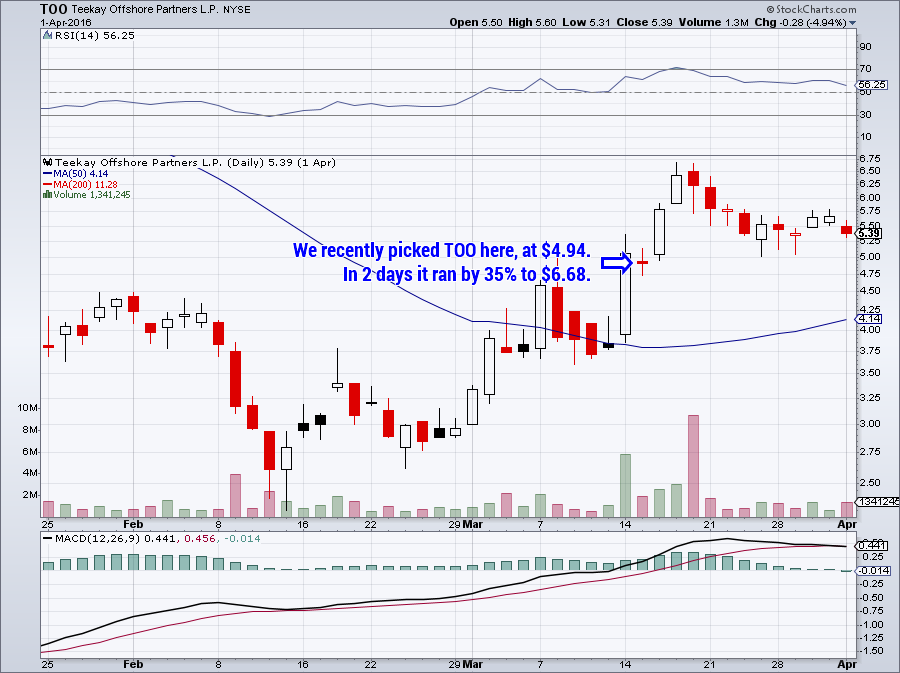 TOO (long buy) - we profiled TOO at $4.94 on March 15th, 2016– In 2 days on March 17, 2016 it ran by 35% to $6.68.
