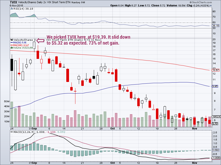 TVIX (short sell) - we profiled TVIX at $19.39 on September 1st, 2015 – It slid down to $5.32 as expected by December 2nd, 2015 bringing 73% of net gain for our subscribers.