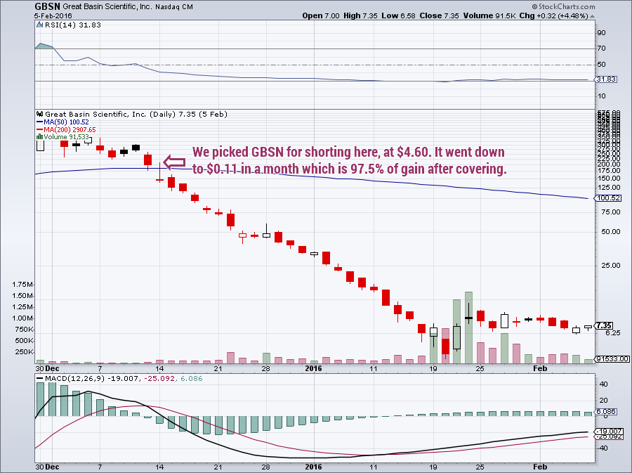 GBSN (short sell) - we profiled GBSN at $4.60 on December 14th, 2015 – it went down to $0.11 in a month making 97.5% of gain for our subscribers on Junuary 20, 2016.